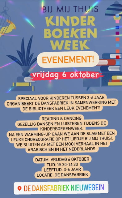 Reading & Dancing! Gezellig dansen en luisteren tijdens de Kinderboekenweek. Na een warming-up gaan we aan de slag met een leuke choreografie op het liedje "BIJ MIJ THUIS"! We sluiten af met een mooi verhaal in het Arabisch en in het Nederlands.